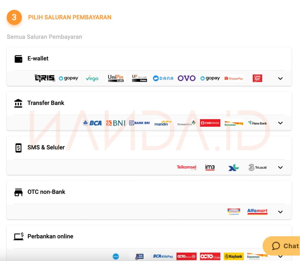 #4. Selanjutnya tentukan metode pembayaran yang akan digunakan. Di UniPin, kamu bisa bayar pakai berbagai metode, seperti: pakai pulsa, transfer bank, pakai e-wallet (seperti OVO, GoPay, DANA, dan sebagainya), bisa juga bayar melalui Indomaret/Alfamart, dan banyak lagi.