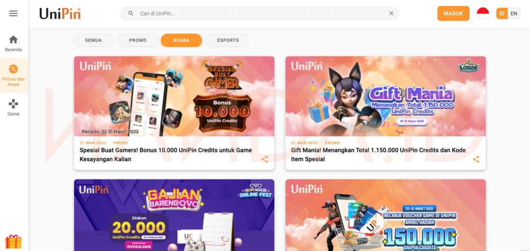 #1. Buka web UniPin.com, lalu masuk ke halaman promo top up game (menu: promo dan acara).