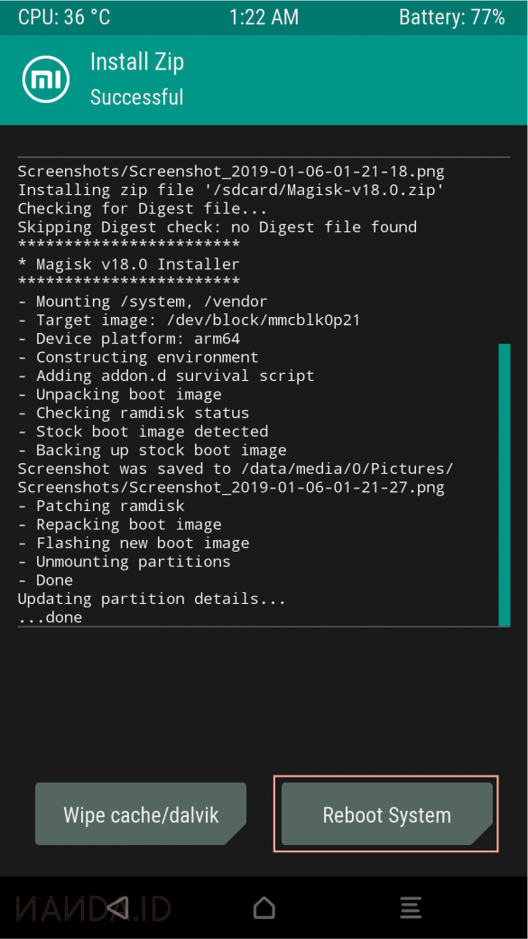 Jika proses Flash sudah selesai, silahkan pilih Reboot System.