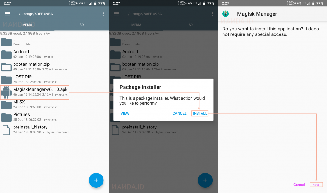 Cari file Magisk Manager yang sudah kamu pindahkan sebelumnya lalu instal seperti biasa. Jika kurang paham lihat gambar di bawah.