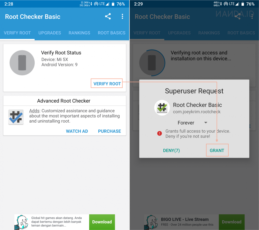 Instal dan buka aplikasi Root Checker lalu pilih VERIFY ROOT jika muncul pop up meminta akses Superuser Request maka ijinkan saja dengan cara pilih GRANT, itu tandanya Smartphone kamu sudah ter-Root.